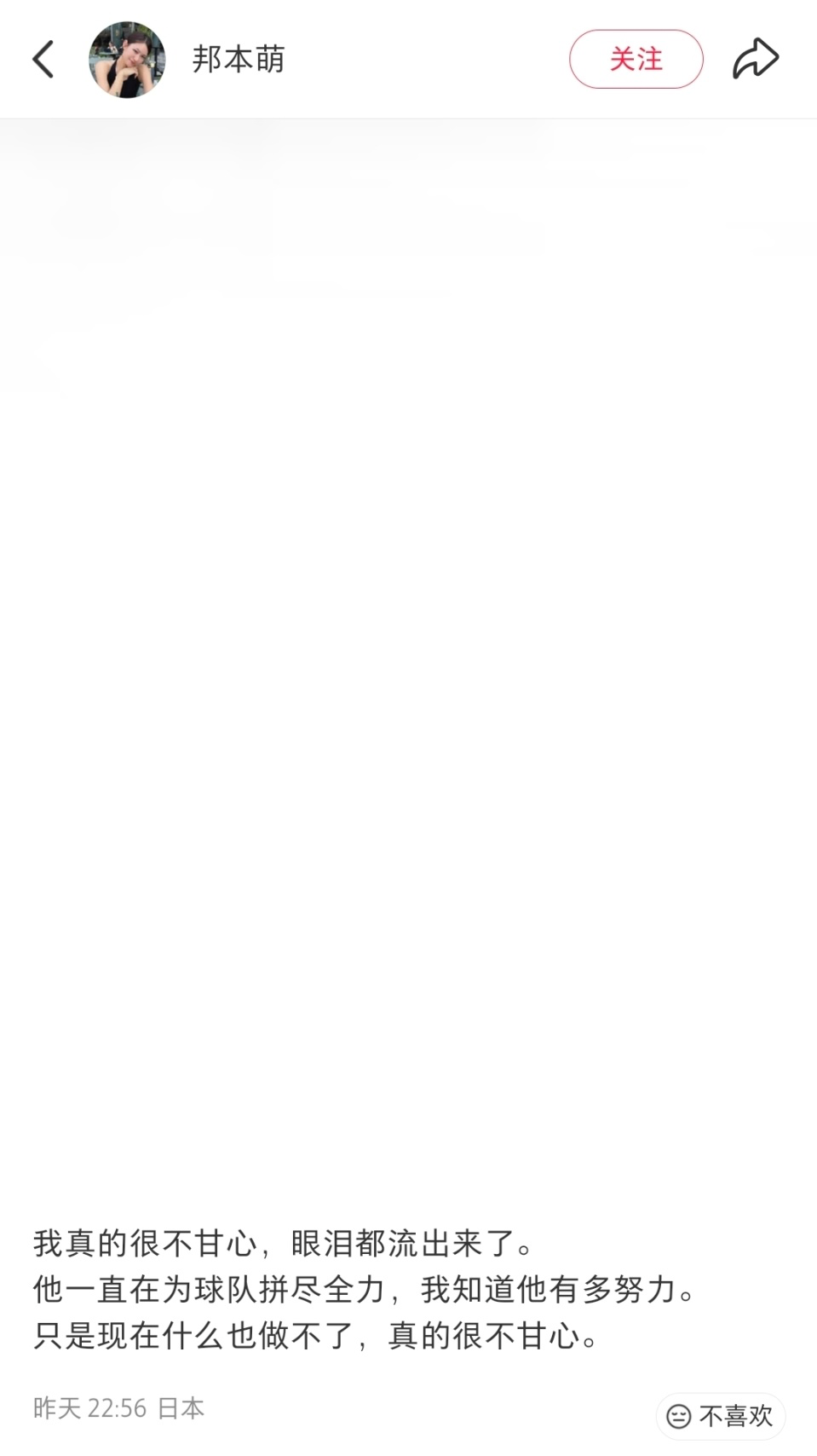 邦本萌写道:“我真的很不甘心,眼泪都流出来了。他一直在为球队拼尽全力,我知道他有多努力。只是现在什么也做不了,真的很不甘心。